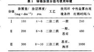 鋅鉻涂層分級與使用環(huán)境見表1。